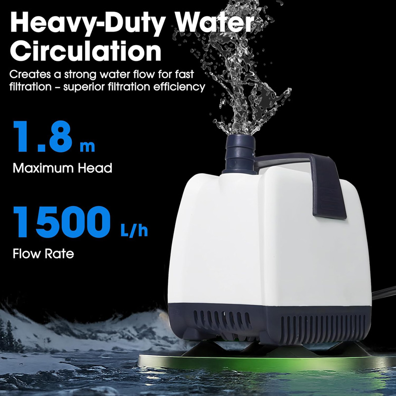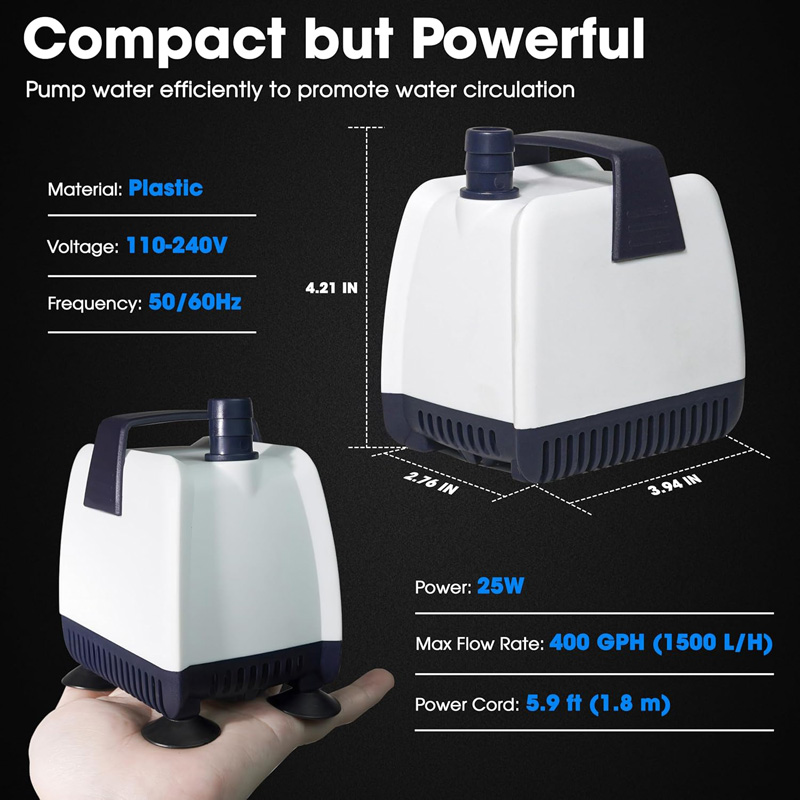 + Powerful & Compact 25W Submersible Pump Powerful 25W small water pump delivers up to 1500 L/h with a max lift height of 1.8 m. This compact aquarium pump (4.72 x 4.13 x 4.25 inch) provides strong water flow for fish tanks, aquariums, cat fountains, and pet water features. Designed for reliable performance, this mini submersible pump combines power with quiet operation for a clean, healthy aquatic environment.