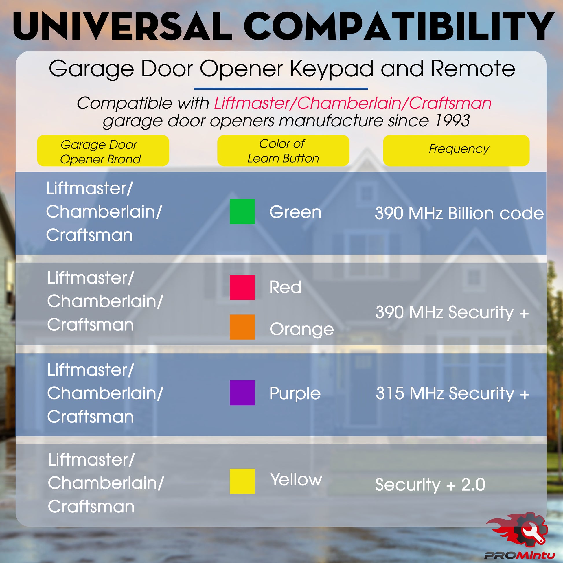 UNIVERSAL COMPATIBILITY: The 893MAX Garage Door Opener Remote and the 877MAX Garage Door Keypad Opener are compatible with Lift master Chamberlain and Sears Craftsman garage door opener manufactured after 1993, make sure that your garage door opener has Red/Orange Learn Button ( 390 MHz Security+) Green Learn Button (390 MHz Billion Code) Purple Learn Button (315 MHz Security+) Yellow Learn Button (Security + 2.0) .Does not work with Craftsman 200.57933, 57943, 57953 series and 100 CR1150, 139.57943, 139.57953 models